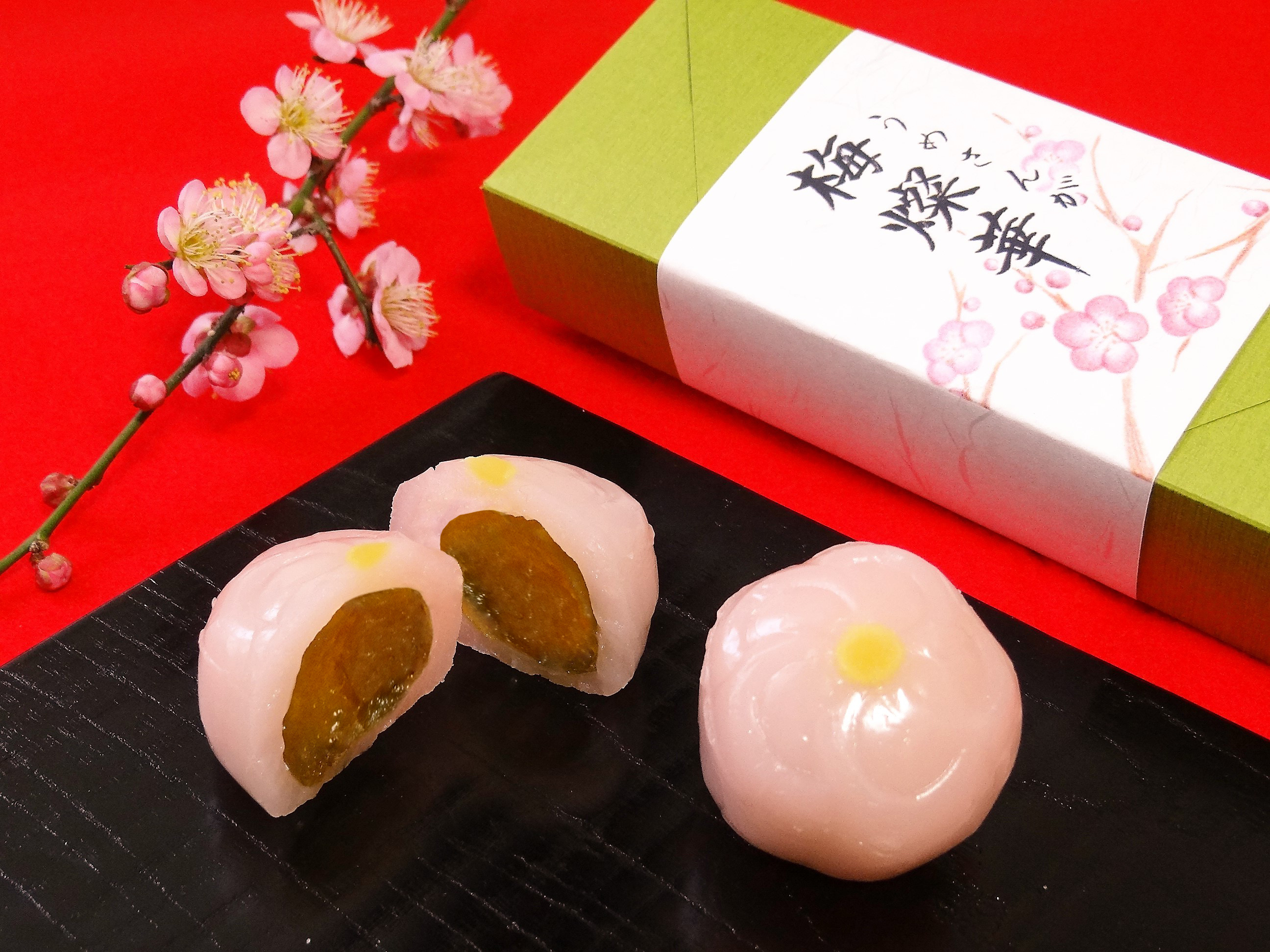 蜜漬け青梅に小田原産の梅を練り込んだ白羊羹を入れ、ういろう生地で包だ独特の風味と食感のお菓子です。